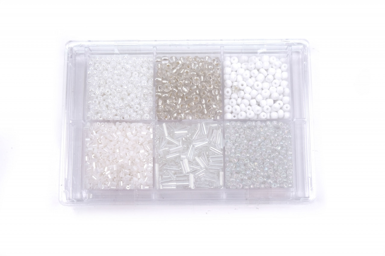 Skleněné korálky nadružené v různých velikostech, druzích a barvách v plastové krabičce se šesti zásobníky, váha obsahu cca 80 g. Nevhodné pro děti do 6 let. Alternativní název: skleněné korálky, skleněné perličky, mačkané korálky.