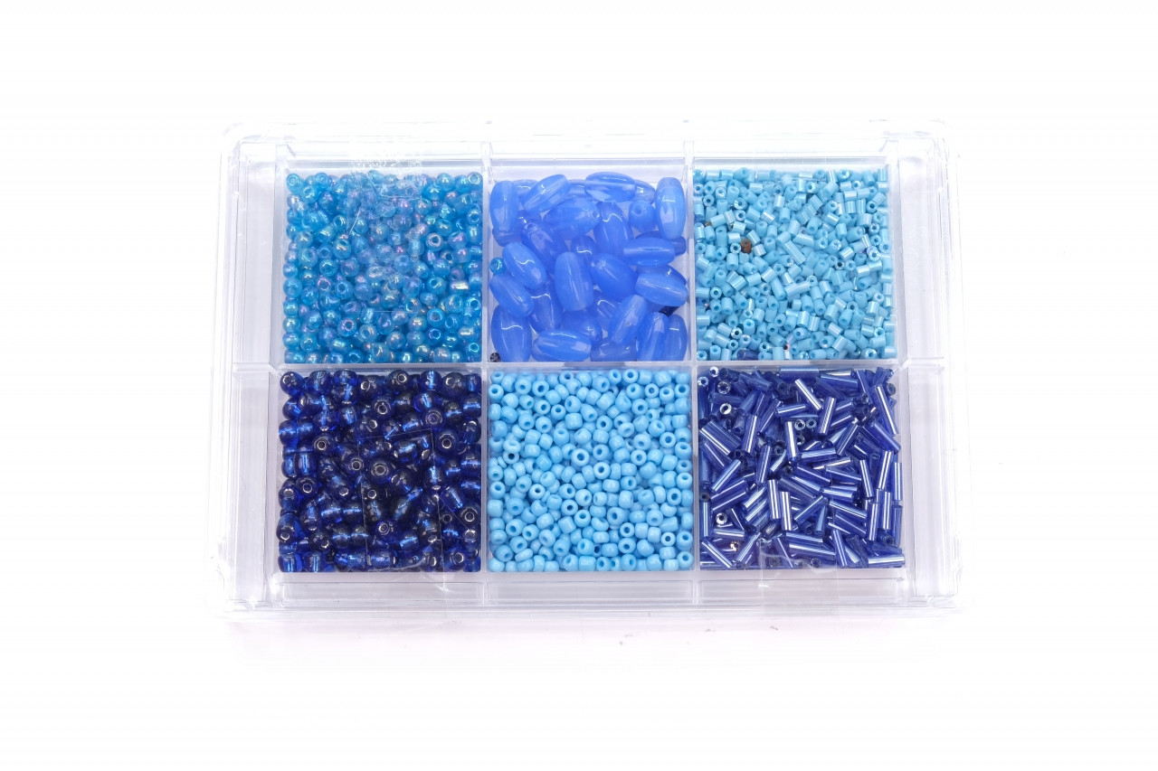 Skleněné korálky nadružené v různých velikostech, druzích a barvách v plastové krabičce se šesti zásobníky, váha obsahu cca 80 g. Nevhodné pro děti do 6 let. Alternativní název: skleněné korálky, skleněné perličky, mačkané korálky.