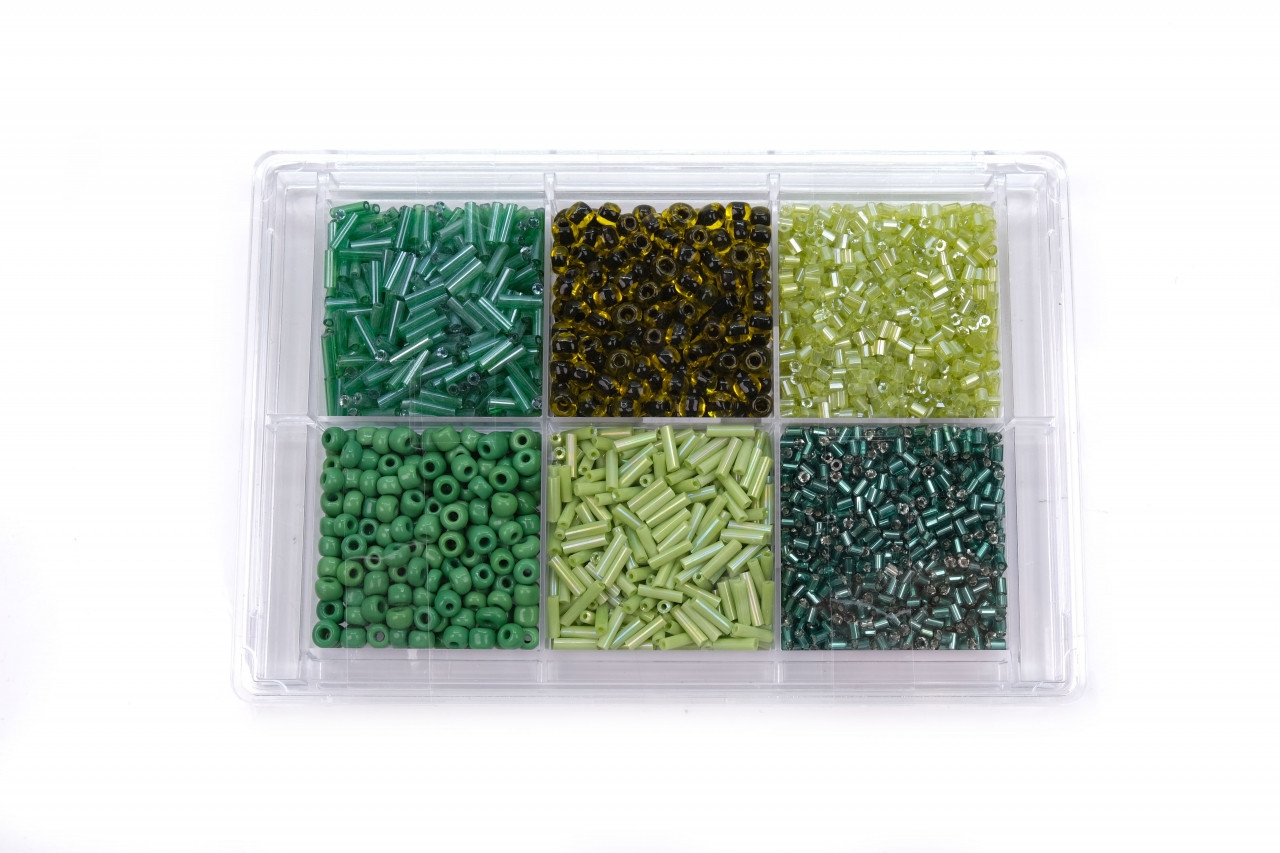 Skleněné korálky nadružené v různých velikostech, druzích a barvách v plastové krabičce se šesti zásobníky, váha obsahu cca 80 g. Nevhodné pro děti do 6 let. Alternativní název: skleněné korálky, skleněné perličky, mačkané korálky.