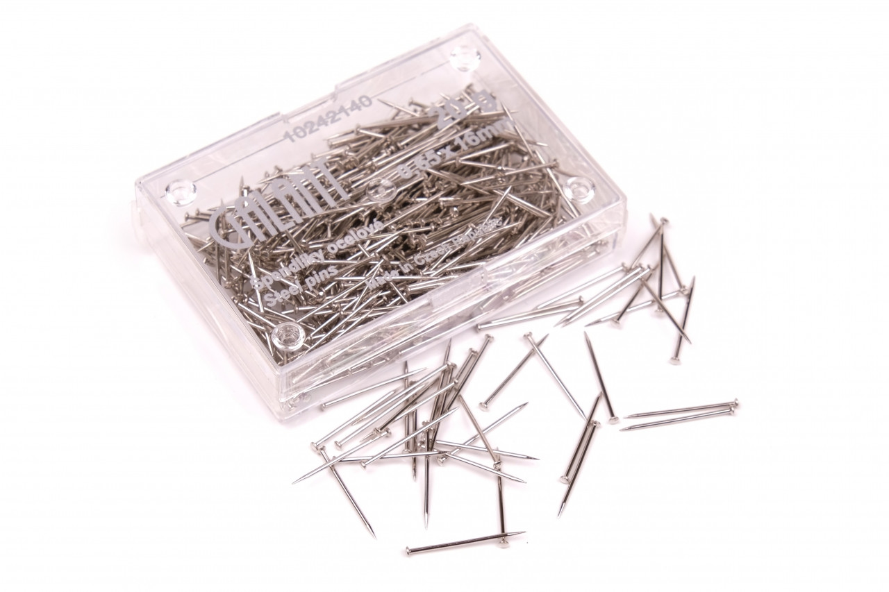 Špendlíky celokovové ocelové, v plastové krabičce, balení 20g, délka špendlíku 16mm , průměr drátu 0,65mm, počet kusů v krabičce cca 450 ks.