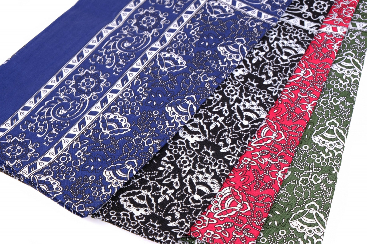 Bavlněný šátek s krásným bohatým potiskem. Kašmírový vzor odkazuje na orientální dálky. Šátek je vhodný doplněk pro motorkáře, turisty, sportovce či hudebníky.