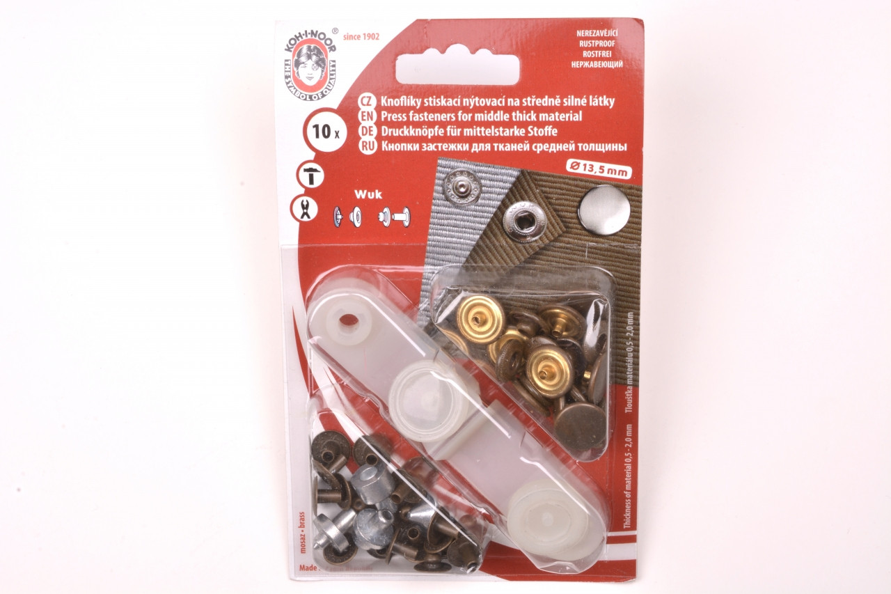 Na blistru je 10 ks nýtovacích knoflíků WUK o velikosti 13,5mm. Knoflíky se používají ke spojování středně silných látek. Nýtování se provádí mini lisem, který je součást balení. Knoflíky stiskací nýtovací jsou nerezavějící.