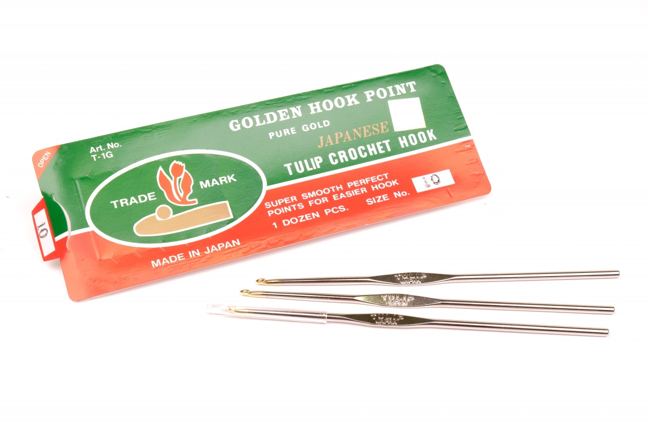 Celokovový pletací háček Tulip se zlatou špičkou. Využívá se především při háčkování z háčkovací příze a výrobě dutinek z rokajlových korálků. Vybrat si můžete z mnoha velikostí, které odpovídají různým typům příze.