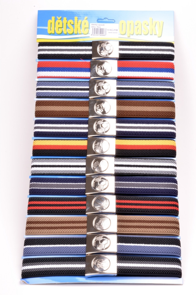 Dětský pružný opasek lze nastavit podle potřeby. Pásek zdobí stříbrná spona, díky které opasek zapnete. Využívá se také jako ozdoba k oděvům. Šířka opasku je 3 cm. Baleno po 10ks v různých barvičkách.