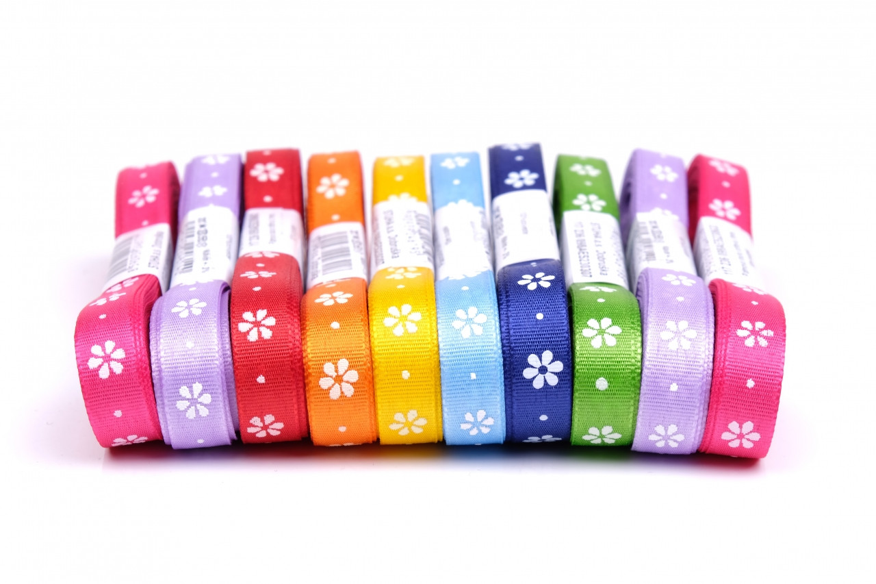 Taftová stuha s motivem květinek. Stuha je vhodná na aranžování květinových vazeb, věnců a nebo jiných dekorací. Velmi často používáná na velikonoční dekorace. V návinu po 20m. Alternativní názvy: stuha, mašle, velikonoční stuha, jarní stuha, taftová stuha