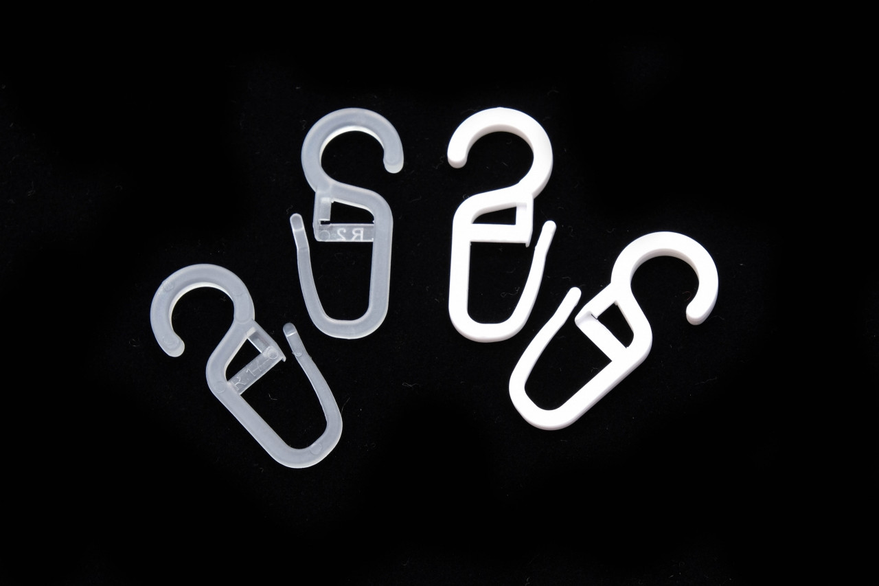 Háčky využijete na záclony. Díky materiálu, ze kterého jsou vyrobené, mají nízkou hmotnost. Rozměry: 15 x 34 mm