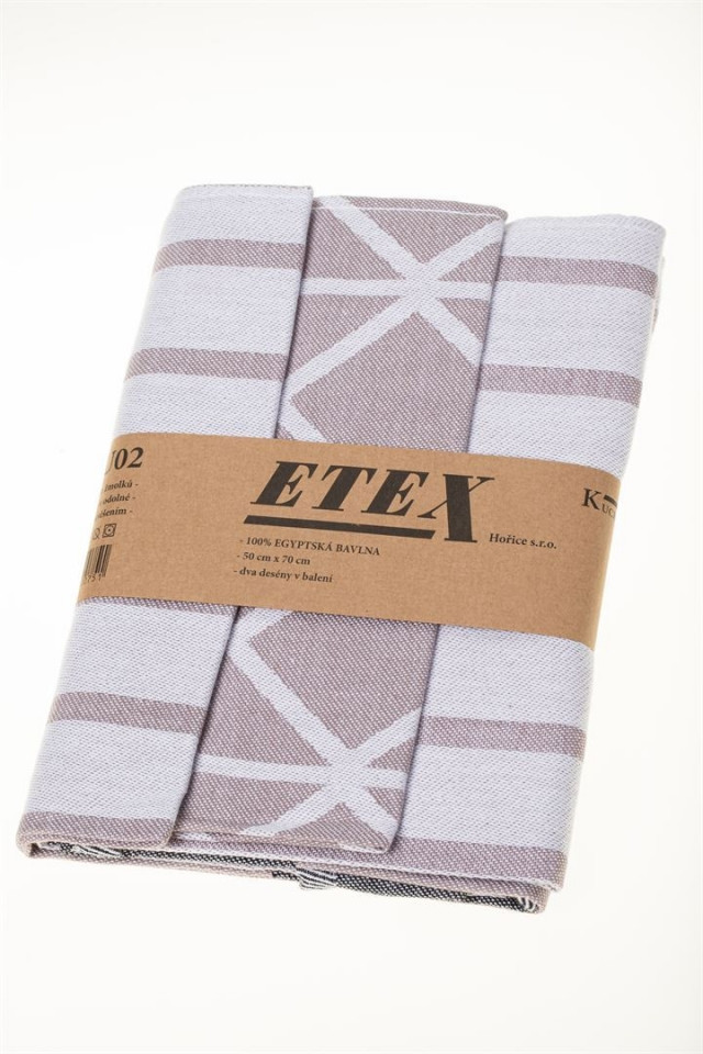 Kuchyňské žakárové utěrky s praktickým poutkem na zavěšení z česané příze, kde jsou vždy dva desény laděné do barvy.