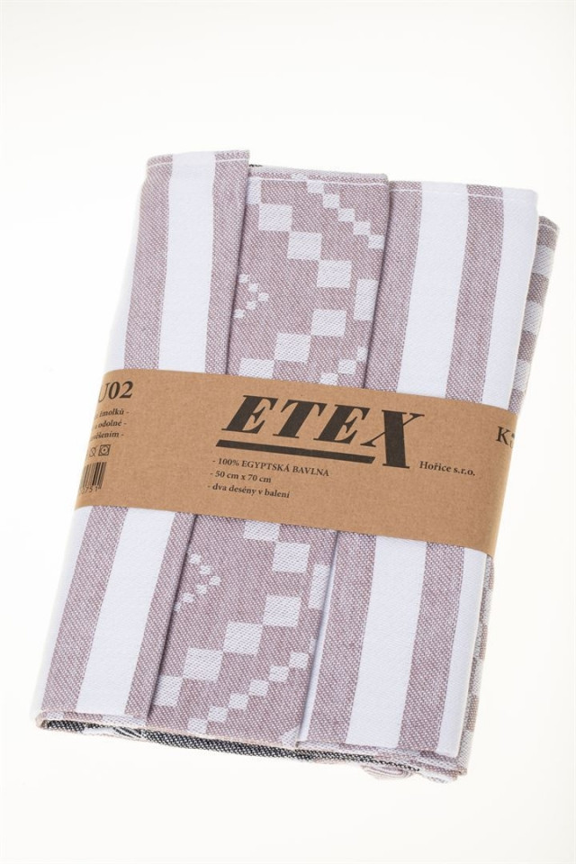Kuchyňské žakárové utěrky s praktickým poutkem na zavěšení z česané příze, kde jsou vždy dva desény laděné do barvy.