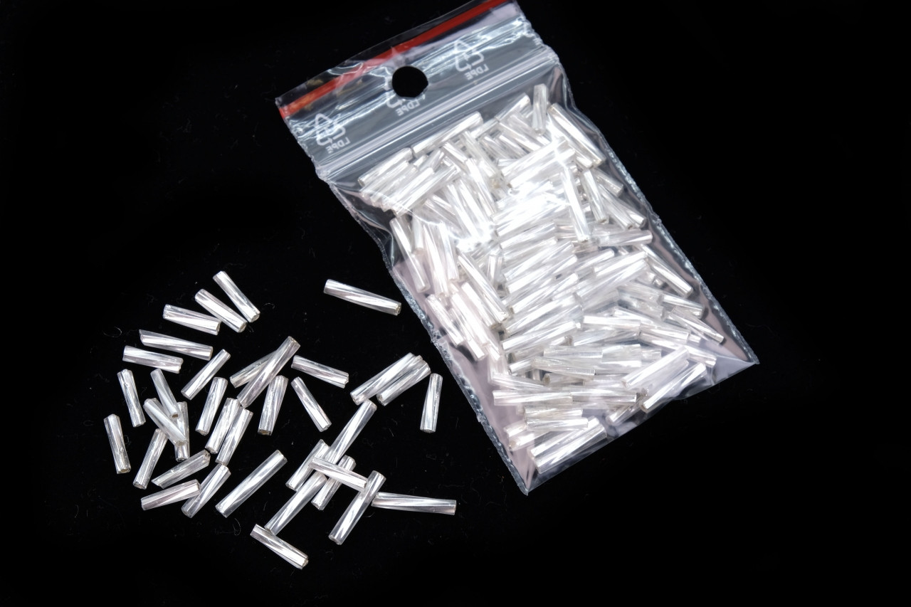 Korálky skleněné řezané délka 10mm 10g stříbro