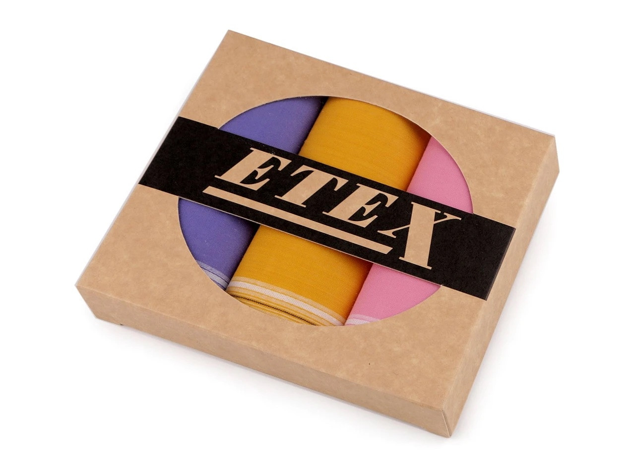 Sada pánských kapesníků je vhodná jako dárek pro muže, kteří si potrpí na kvalitu a eleganci. Jsou ideální volbou pro každodenní použití i speciální události. Mají různé dezény od proužků, kostiček až po káro. Jsou velice kvalitní, oceníte jejich jemnost i dlouhou životnost. Kapesníky jsou zabalené v dárkové krabičce přírodního vzhledu s kulatým průhledem. V krabičce najdete 3 čtvercové kapesníky. Skladba kapesníků se v jednotlivých krabičkách může lišit. Kapesníky jsou vyrobené ze 100% bavlny, prochází náročnou atestací na kvalitu materiálu a barevnou stálost v rámci normy EKO-TEX100.